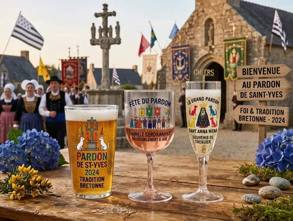 Le pardon, c'est le rendez-vous que la Bretagne se donne à elle-même depuis des siècles. Le matin appartient au sacré — procession, cantiques, cierges portés à bout de bras sous la pluie ou le soleil selon ce que Dieu décide ce jour-là. L'après-midi appartient aux vivants — les tables se dressent, les familles se retrouvent, les anciens racontent et les enfants courent entre les stands. Et quand le soir arrive, si un biniou se fait entendre au loin, personne ne rentre vraiment. Nos verres et gobelets personnalisés accompagnent ce moment-là — l'après, le repas, le verre levé entre les mains de ceux qui se retrouvent une fois l'an.
