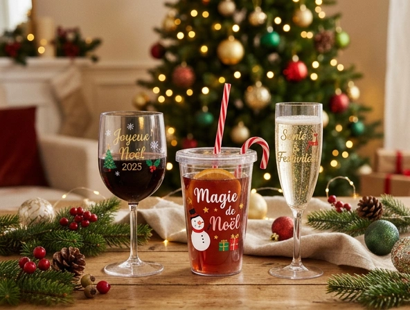 Enchantez vos fêtes de fin d'année avec des verres Noël personnalisés et gobelets réutilisables Noël festifs qui créent la magie des réveillons et repas de Noël. Du traditionnel au contemporain, nos créations personnalisées transforment votre table de fête en scène enchantée et offrent des cadeaux de Noël originaux qui surprendront vos proches.